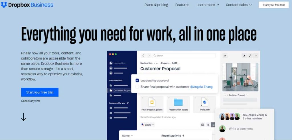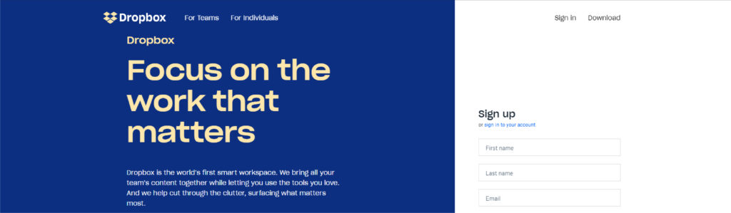 The subheading is also kept simple, but it works: “Access all your files regardless of location or device and share them with anyone.” You don’t have to decipher what Dropbox is doing first.