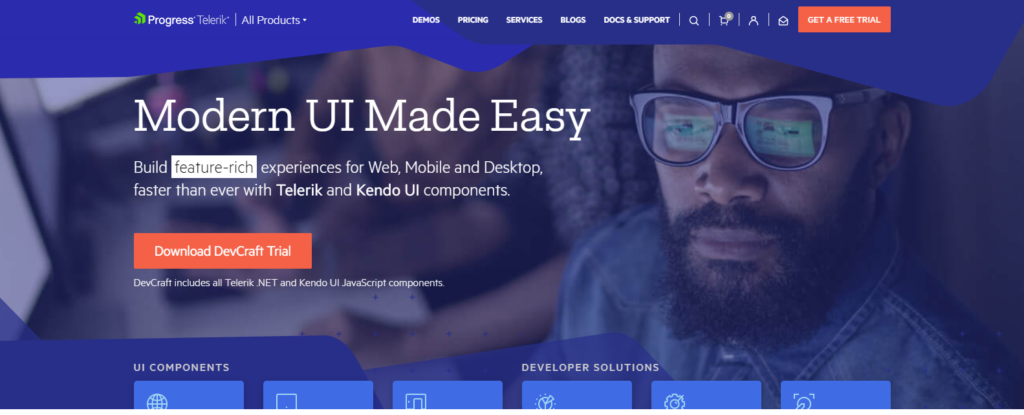 As a visitor to the Telerik homepage, despite a lot of information, you don’t have the feeling that you are overwhelmed. At this company, which offers a wide range of technology products, the bold colors, attractive designs and video elements are reminiscent of Google. Among other things, this aspect ensures that visitors feel welcome and know that they are dealing with real people.